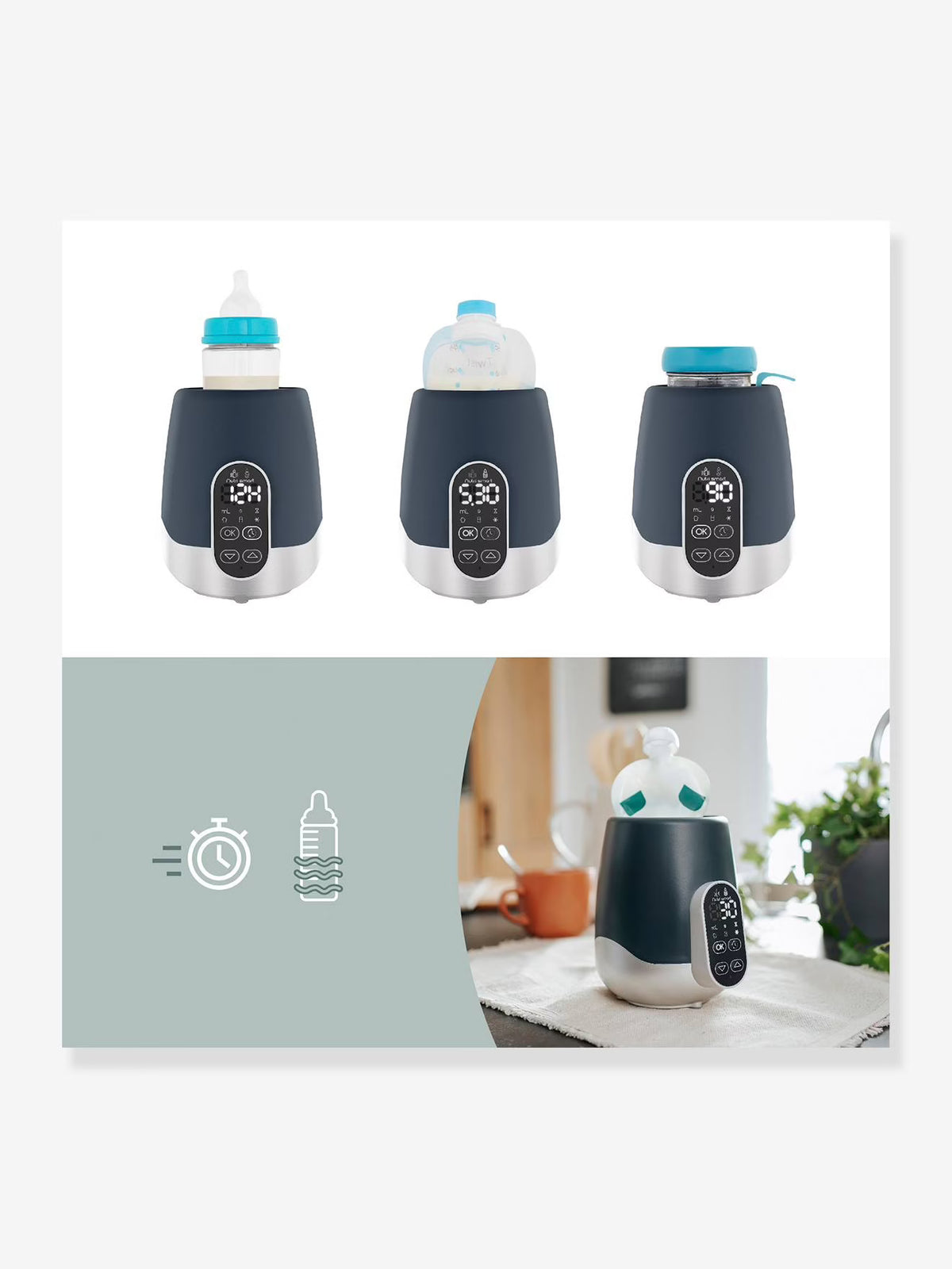 - Automatic heating: keeps the contents of the bottle or small bottle at an ideal temperature of 37°C for 1 hour